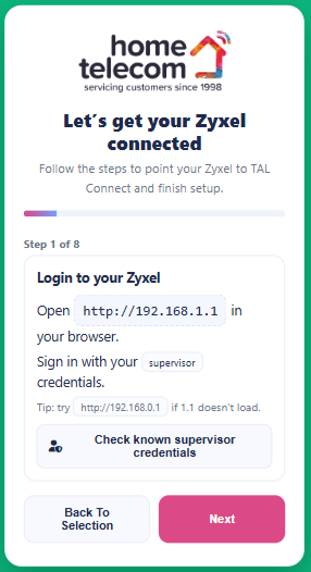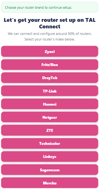 - Select your router brand (for example, Zyxel). If your router brand isn’t listed, please contact our support team, who can guide you through a tailored setup.